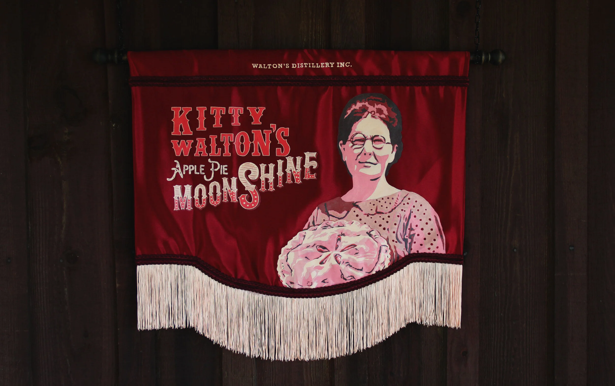 This is a banner advertising a product of Walton’s Distillery Inc., miss Kitty Walton’s Apple Pie Moonshine.